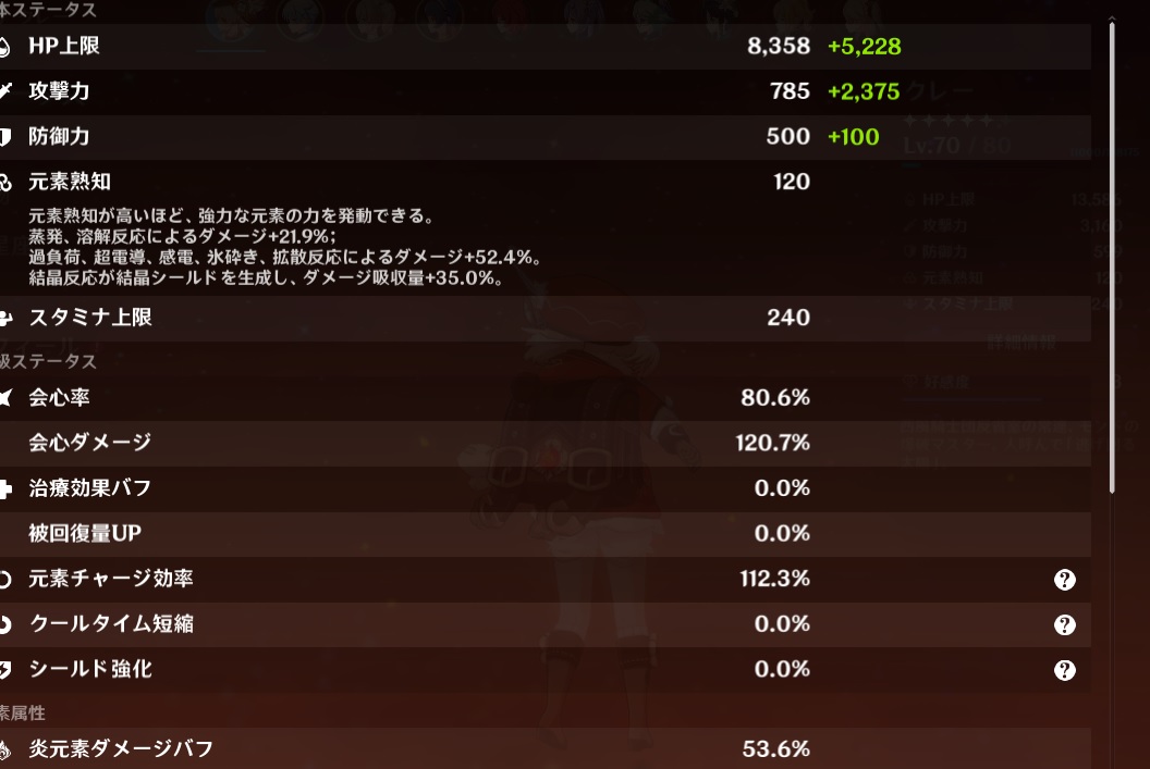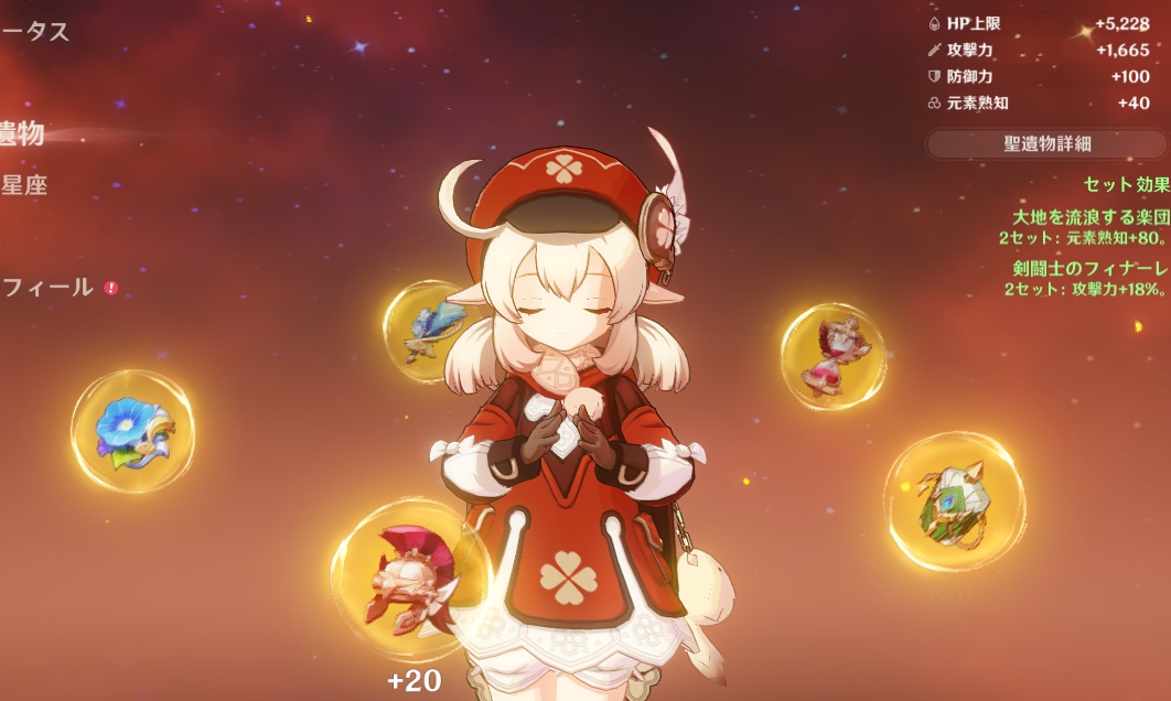杯は風バフ、冠が未だ星4の会心率で他も厳選とは程遠いけど、天賦9だと単発威力も頼りになる