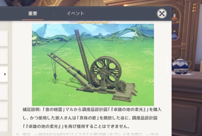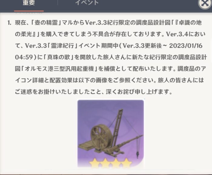 今バージョンの紀行家具が高級紀行買ってない人でもマルから変えてしまうバグのやつ、高級紀行買った人向けに補償として3.4に新しい紀行限定家具設計図を配布し直すって結果になったんだが↓これがバグで紀行家具じゃなくなって恒常になりさがった綺麗な家具で