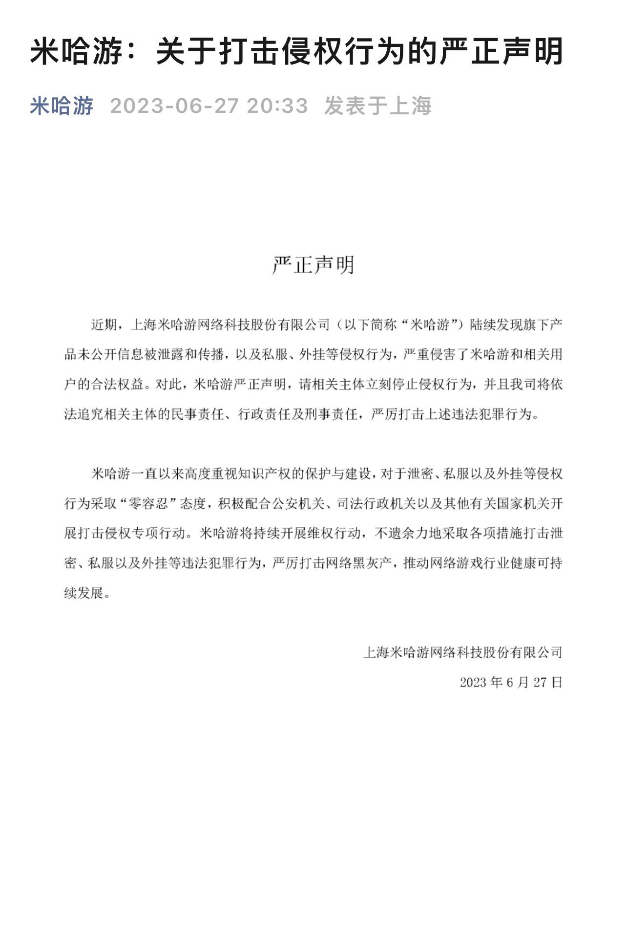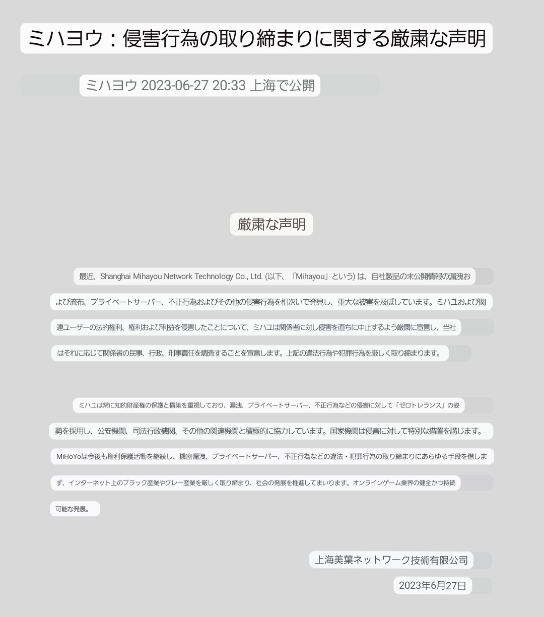 - 【悲報】ミホヨさん、大規模リークに対して遺憾の意を表し関係者に対して法的措置を取る検討をする方針を固める意向を発表